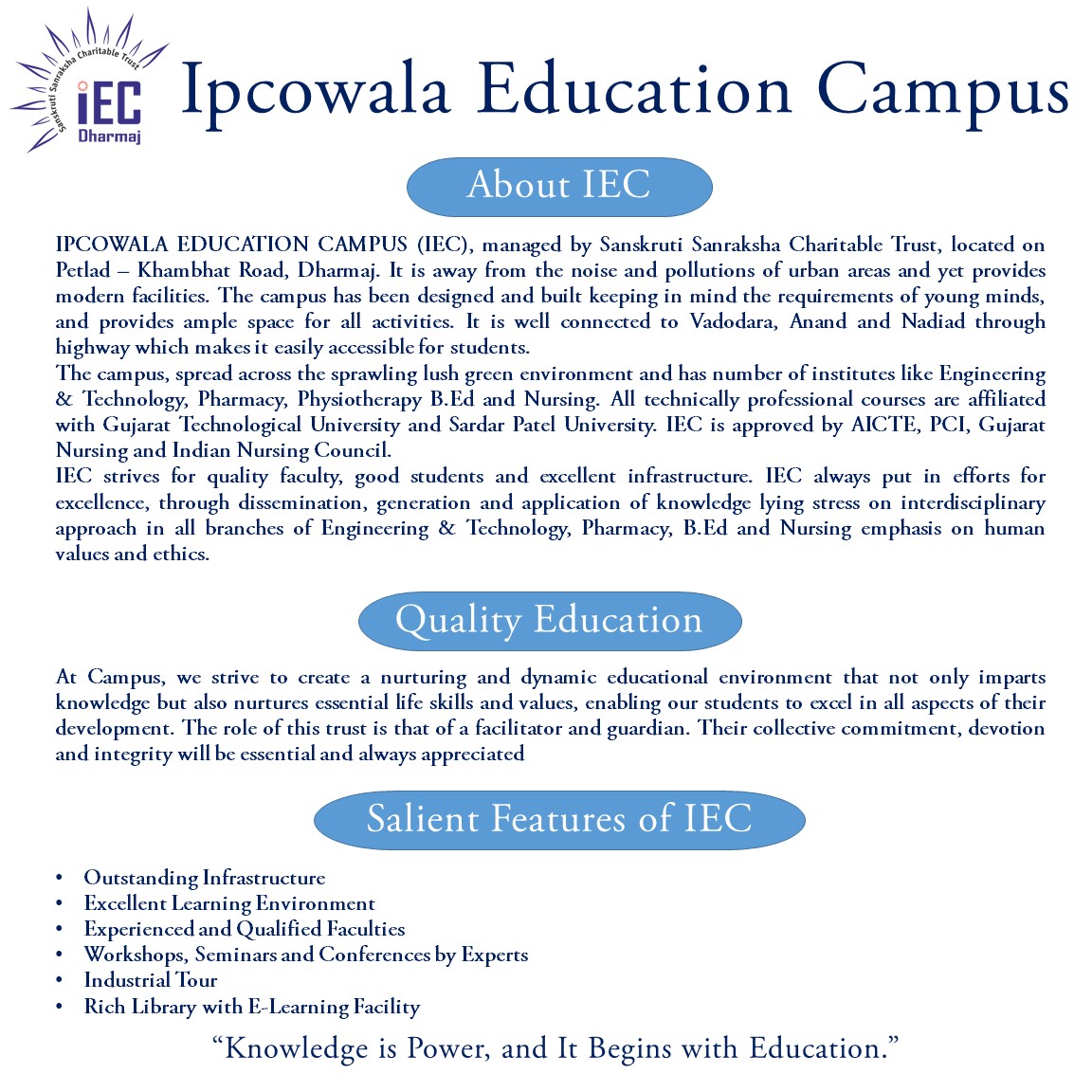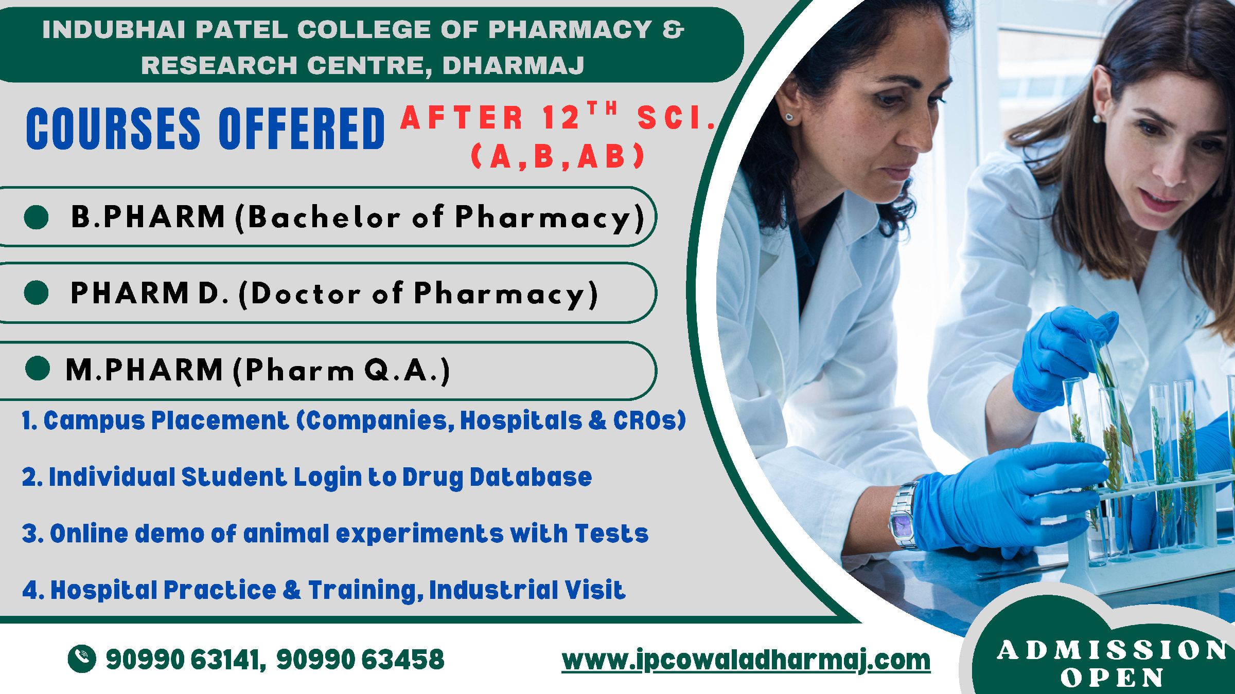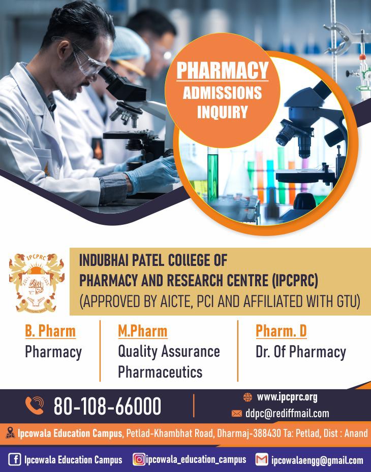 IPCPRC is one of the leading institute in the field of Phamaceutical Education, providing topnotch pharmacist to serve society who have imbedded virture of "वसुधैवकुटुम्बकम" (All world is a Family). Institue not only provides technical knowledge but also nourishes all students with skills to withstand all kinds of situation in life. Our belief is; hard-work leads to success. Indubhai Patel College of Pharmacy and Research Centre (Formerly known as Dharmaj Degree Pharmacy College) started in the year 2006 with a vision to provide education in the vicinity of Charutar region. The institute is managed by SanskrutiSanraksha Charitable Trust. The instituteis approved by AICTE, PCI and affiliated to Gujarat Technological University, Ahmedabad.