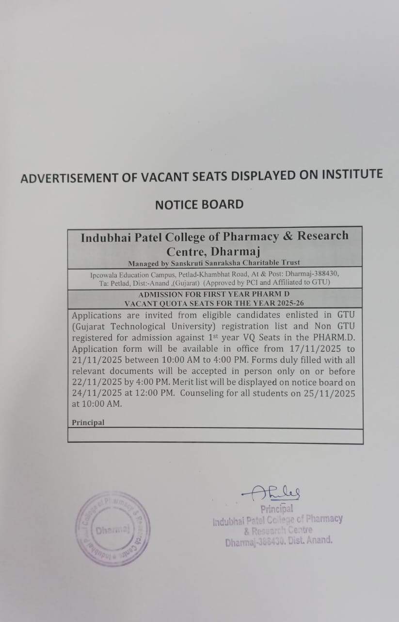IPCPRC is one of the leading institute in the field of Phamaceutical Education, providing topnotch pharmacist to serve society who have imbedded virture of "वसुधैवकुटुम्बकम" (All world is a Family). Institue not only provides technical knowledge but also nourishes all students with skills to withstand all kinds of situation in life. Our belief is; hard-work leads to success. Indubhai Patel College of Pharmacy and Research Centre (Formerly known as Dharmaj Degree Pharmacy College) started in the year 2006 with a vision to provide education in the vicinity of Charutar region. The institute is managed by Sanskruti Sanraksha Charitable Trust. The institute is approved by Pharmacy Council Of India(PCI), New Delhi and affiliated to Gujarat Technological University(GTU), Ahmedabad. We thank Late Shri Indubhai M. Patel (Ipcowala) for his immense contribution towards the institue.As receiver of a plenitude of respect and awards Shri Indubhai M. Patel was honored with “Bhamashah” (man of at most love and sacrifice) & first Pharmacist of Dharmaj, and hence the name of the institute was changed to Indubhai Patel College of Pharmacy and Research Centre(IPCPRC), in the year 2008.